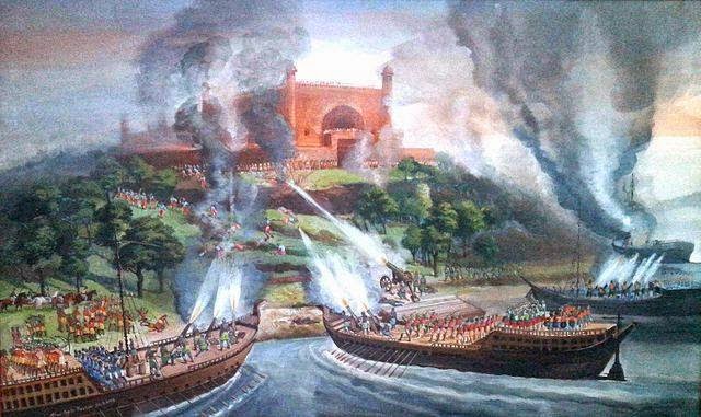 မင္းမာန္ႀကီးမုိးေပါက္ ႏွင္႔ ေပၚတူဂီတုိ႔အား ရ/ခုိင္ဘုရင္႔တပ္ေတာ္မ်ား တုိက္ခုိက္ေနပုံ (စစ္တေကာင္းၿမိဳ႕ )